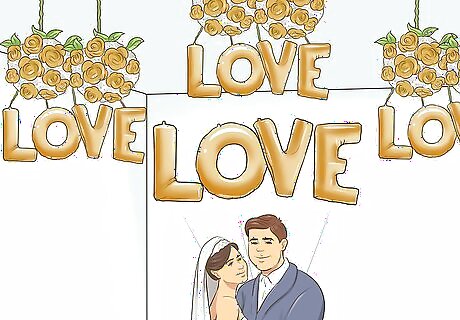 Match the centerpiece with the style of your wedding. Just as with floral centerpieces, it's important that the light-based or sculptural centerpiece you use matches the style of your wedding. A “classic” style non-floral centerpiece may feature an ornate silver, gold or crystal chandelier, which enhances your wedding's elegant feel. You can incorporate a floral element by adding garlands of flowers that twist around the arms of the chandelier. A “rustic” or “edgy” style centerpiece could feature a canopy of string lights, or a “chandelier” of mismatched lighting including paper lanterns, Edison bulbs and lights in jars. This gives your centerpiece a unique and hand-crafted feel. An “artsy” style centerpiece could be made of intricately cut paper, ornate pompom style sculptures, or even classy, metallic balloon letters in words like “love” or “forever.” A “modern” style centerpiece can feature a chandelier of lights in geometric jars or containers, or “curtains” of hanging lights.