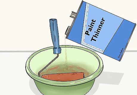 Soak the roller in paint thinner before rinsing it if you used oil-based paint. You can't simply rinse the oil-based paint roller in the sink since it can damage your plumbing. Instead, fill a bucket with paint thinner and put the roller in it. Soak the roller for at least 2 or 3 hours. Then, lift the roller out of the paint thinner and rinse the roller under cold water until the water runs clear.Tip: Work in a well-ventilated space so you don't breathe in the fumes from the paint thinner. Open windows or work outside, for instance. You could also use mineral spirits instead of paint thinner since it will also remove the oil-based paint. Don't pour the paint thinner down the sink. Follow the manufacturer's disposal instructions.