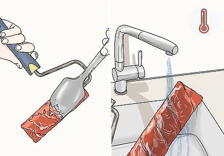 Use warm water to rinse latex or acrylic paint from the roller. Use a rubber spatula to scrape excess paint from the roller into the paint can or tray. This reduces the amount of paint that you're washing down the drain. Then, take the roller to a sink and run warm water over it. Gently massage the roller to loosen the paint. Keep rinsing until the water runs clear. Don't rinse oil-based paint in the sink since water won't remove the paint.