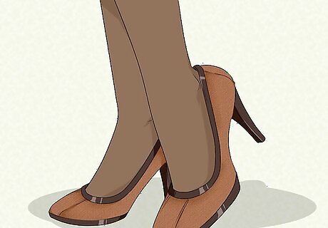 Choose rustic footwear. If you want to give off a rustic feel on your wedding day, make sure you wear rustic shoes. Instead of fancy footwear with lace and sparkles, go for played down shoes made from simple materials. If you want a really simple look, go for a simple pair of laced brown shoes made out of a material like suede or leather. If you want heels, find a way to give heels a rustic vibe. Have bows attached made from burlap fabric or pick a duller color, like dark gold, instead of a sparkly, vibrant shade. Shoes with a crocheted pattern can also give off a rustic vibe. Consider getting a pair of white flats with a nice crocheted pattern.