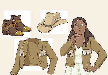 Think about cowboy accessories. The cowboy look is one way to give your outfit a rustic feel. Cowboy boots can help give off a rustic vibe, as well as cowboy hats and jackets. You can go for shorter cowboy boots, that do not reach your knees, or knee-high boots. Take your dress's length into account when choosing boots. Pick boots that will be easy to see while you wear your dress. Wear a denim jacket over your dress. This can work well for sleeveless dresses, especially if you're having an outdoor wedding on a chilly day. Try wearing a cowboy hat in place of a veil if you want a cowboy look. If you want to add a little color to your outfit, use your boots, hats, or jacket to do so. You can, for example, wear blue boots to add the "something blue" to your wedding day theme.