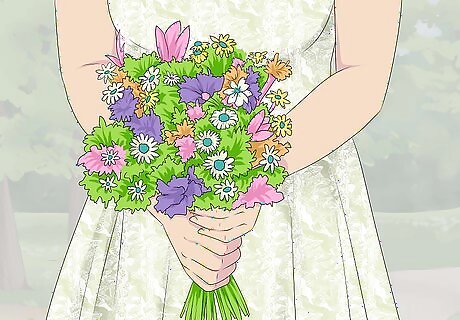 Carry a bouquet of wild flowers. If you're carrying a bouquet down the aisle, opt for wild flowers. This will give off a rustic vibe as the bouquet will look like it's taken straight out of nature. This is fitting with the simple feel of a rustic wedding. Do not go with elaborate patterns for your bouquet. Simply bundle the flowers together in a casual, somewhat haphazard arrangement to keep things looking rustic.