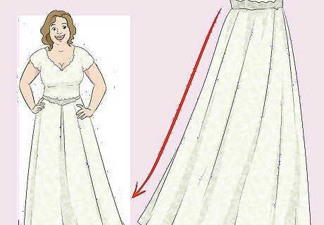 Try a long dress with minimal embellishments. Longer dresses tend to give off a country vibe. Look for dresses that are longer cut. You can have a dress that flows down to your feet or a dress that goes past your knees. Choose a long dress without a lot of beads, lace, or other embellishments, as this gives off the simple, rustic feel. If your footwear is important for your big day, choose a dress that shows off your shoes. If you plan on wearing, say, cowboy boots, do not wear a dress that covers your feet.