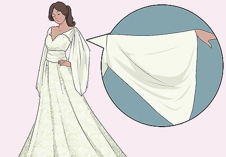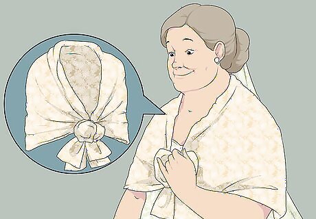 Wear a knit shawl. A shawl can give off a county feel that's perfect for a rustic wedding. If you don't mind throwing something over your wedding dress, consider wearing a knit shawl over your shoulders. If you want something a big more intricate, you can try a crocheted shawl. A shawl can be a good way to add color to your outfit. If you're looking for "something blue", for example, wear a blue shawl.