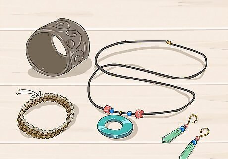 Add some rustic jewelry. Use your jewelry to help showcase your wedding's rustic vibe. Jewelry that's somewhat casual and clunky can help your wedding dress look more rustic. Wear thick bracelets made out of rural materials like wood. Go for big, clunky earrings made out of casual materials like beads or feathers. Wear beaded necklaces in bright colors like turquoise.