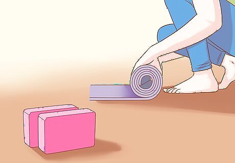 Line up your mat with your neighbor’s and collect any props needed. If you’re in a beginner’s class, you may not need any props. Ask your teacher what you need or take a cue from everyone else. Most often, you might need a yoga block or straps, and your studio should provide these things for you. In general, try to leave at least 1 foot (12 in) between your mat at your neighbor’s mat. For smaller classes, you may be able to have even more space. For bigger classes, you may have to get closer together.