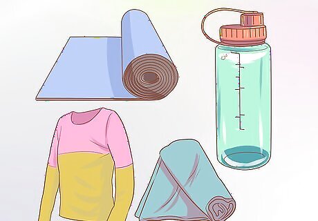Bring your mat, a water bottle, a towel, and a long-sleeved shirt to class. You may not need a towel if you don’t sweat easily, but if you do, it can help to have one so you can wipe off your mat and hands as needed. Yoga studios can get cool toward the end of class as you move less and less, and a long-sleeved shirt can help keep you from getting chilly. Leave your phone in your gym bag so it doesn’t go off and distract anyone during class.