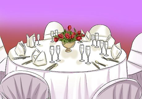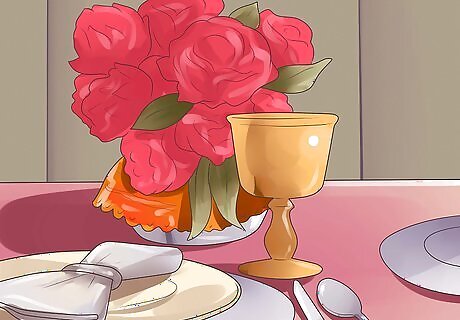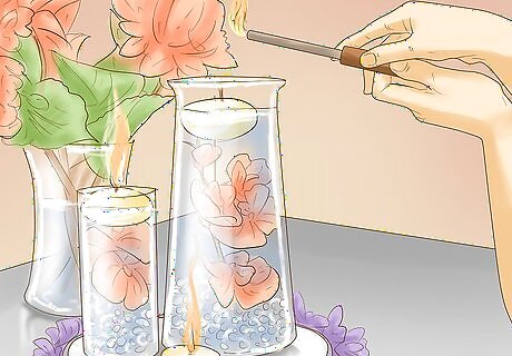 Decorate with candles. Candles give off a nice elegant vibe. Try placing candles on tables or near the food buffet. Use elegant colors, like ivories, whites, and light shades of pink, purple, and blue. For extra elegance, use intricate, attractive candle holders, like crystal candle holders.
