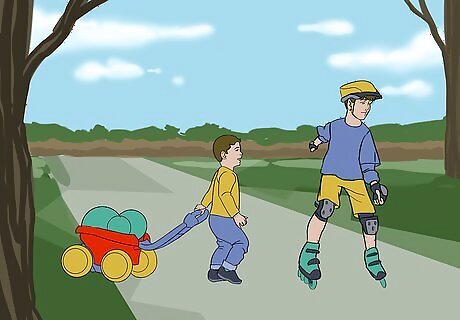 Select toys that are powered by kids. If you want to get your child active and moving you may want to select a toy that is powered by your child. For instance, there are a lot of options for ride-on toys, such as bikes, cars, skateboards and scooters. Some of these options will be motorized, but you can also find human-powered options as well. These types of toys can come in a variety of forms to meet the needs of all age groups. For example, toddlers can use toys such as wagons and little scooters that they sit on and push with their feet. Slightly older children can use tricycles and bicycles with training wheels that are powered using pedals. Older kids can use bicycles, scooters, roller blades, and skateboards that are peddled or pushed using their feet. Make sure your child always wears a helmet and proper safety equipment.