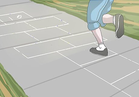 Provide them with sidewalk chalk. Sidewalk chalk is a fun way to get kids outside. Decorating the driveway with colourful pictures will get your kids up and moving around. You can also use sidewalk chalk to draw a hopscotch pattern on the ground and allow your kids to jump and play. Show kids different games they can play, such as four square, or have a drawing competition. Children can also use their imaginations to come up with original games and activities, too.