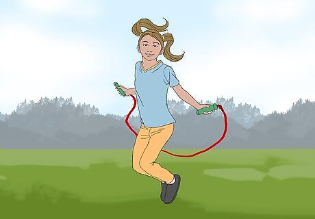 Try jump rope. Jump rope is another way to get kids moving. Typically this is an activity for children 6 and up and can be completed individually using a single rope or with friends using double dutch ropes. There are a number of different games and tricks that can be completed using a jump rope. Your child will develop endurance, strength, and jumping skills. Purchase a jump rope that is plastic or beaded, not cloth. Cloth ropes are too light and are more difficult for young children just learning the basics. Size your child’s rope by having them stand on the middle of the rope. The handles should reach just below the armpits. If the rope is too long tie knots into the rope to shorten it. Turn the ropes for the kids so that they can get a chance to jump in the double dutch ropes.