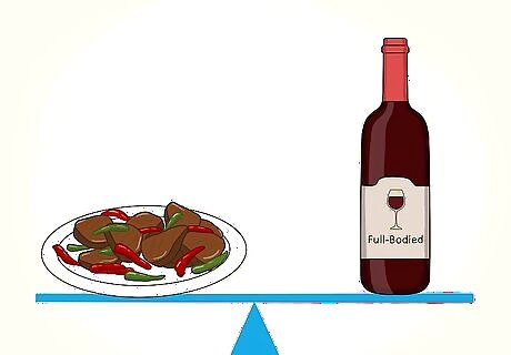 Consider how strongly flavored or rich the meal is, and match it with a similarly full-bodied wine. The idea of "red with meat, white with fish," is far too simple. The more important goal is for the wine and meal to complement each other. A "heavy" meal is usually dense and strongly flavored -- a meat sauce, a spicy dish, or a hearty soup or stew -- and requires a strongly flavored wine to cut into these flavors. You don't want either the dish to overpower the taste of the wine or vice versa -- they should both have a similar depth. Wines that are described as "full-bodied," "deep," "complex," "rich," or "densely layered" are best with heavier meals. Even powerful whites can be deep and complex, making them great with spicy dishes or heartier fare. Wines that are described as "light," "balanced," "crisp," or "refreshing" are great for lighter meals with less powerful flavors -- vegetables, pastas, fish, chicken, and lighter cheeses.