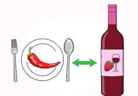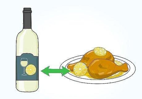Try to find flavors of wine that complement the flavors in the dish through simple matching. Pair, for example, a light, citrus-y white wine with a lemon chicken dish. Use a deep, smokey red to match up with the barbecued pork shoulder. Matching these flavors up will help create a seamless meal experience, highlighting key notes in both the dish and the wine. When picking complementary flavors, think about how the food would taste if that flavor was added from the wine. For example, if you have a deep red with "hints of chocolate, spice, and blackberry," ask yourself if chocolate, spice, and blackberry would look out of place on your plate. There isn't ever a perfect comparison, but it is a good place to start.