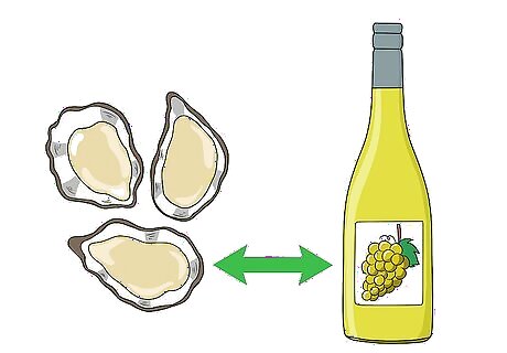 Go bold and search out contrasting flavors to make a dish really pop. There are two schools of thought when pairing wines -- complementing flavors and boldly contrasting them. Neither is completely right, and you should try out both approaches as you get more comfortable choosing wine. When contrasting, think about balance. A salty, acidic food like oysters, for example, is well balanced by a fruity, softer Sauvignon Blanc. A hot, oily curry is well contrasted by an acidic, fresh, and citrus-like red, like a Rose. When considering contrasted flavors, think about the acidity of the food and the texture. Oily or creamy foods are well cut by acidic (sharp tasting) wines, acidic foods are balanced out by fuller, less bitter wines. Big, complex dishes with lots of flavors, like Paella, are well contrasted by simpler, well-balanced wines. This allows the dish to command the "attention" with a light, palate-cleansing wine behind it.