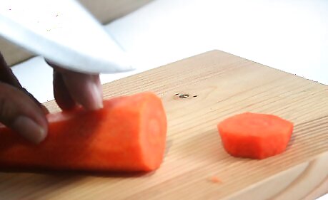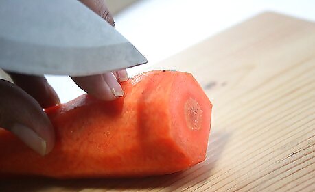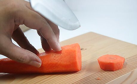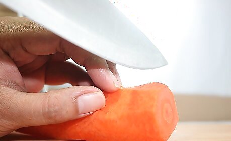 Place one vegetable on the cutting board. With your non-dominant hand, hold the vegetable firmly in place with the surface of your nails pointing toward and parallel to the blade. Ensure that your nails are closer to the blade than the skin of your fingers.