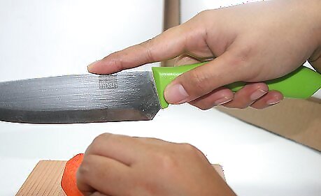 With your cutting hand, firmly grasp the knife at the handle keeping your index finger and thumb at either side of the upper part of the blade or your index finger on top of the blade in order to ensure stability. Make sure your fingers cannot slide under the blade.