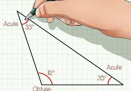 Classify the triangle according to the measurement and the type of angles. Name the triangle as an obtuse triangle if any of the angles are greater than 90 degrees. An obtuse triangle will only have 1 obtuse angle. Classify the triangle as a right triangle if the triangle possess a right angle of 90 degrees. A right triangle will only have 1 right angle. Categorize the triangle as acute if all 3 of its angles are less than 90 degrees. Determine that the triangle is equilateral if all 3 of its angles, (which would have to be acute), are congruent. In an equilateral triangle, all 3 of the angles will be 60 degrees, because the sum of the 3 interior angles in a triangle is always 180 degrees.