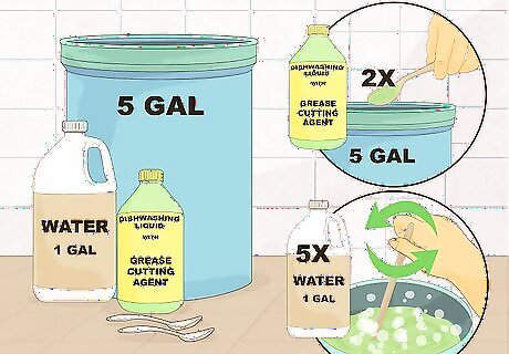Mix water and dishwashing soap together in a 5-gallon (18.92 l) bucket. Mix 1 gallon (3.78 l) of hot water with 2 tablespoons (29.57 ml) of dishwashing soap. Look for a dishwashing liquid that has a grease cutting agent in it and a scent that you like.