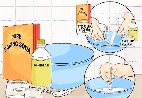Mix 1/2 cup (90 g) of baking soda and 1/4 cup (59.14 ml) of vinegar together. Pour the baking soda and vinegar into a bowl and use a spoon to mix the solution together. As you mix the two ingredients together, it should start to form a paste. If the solution is too thick, add more vinegar to it.