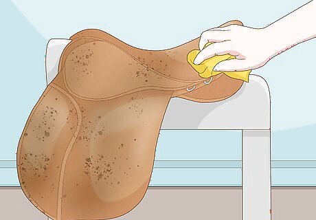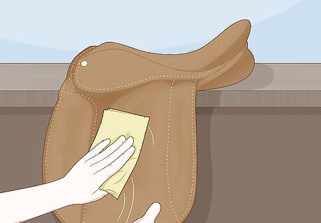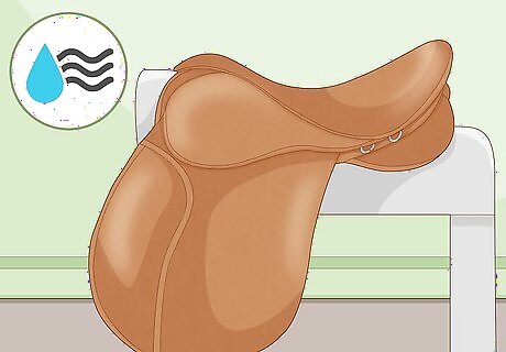 Let your saddle air dry before conditioning it. Washing a leather saddle actively removes the natural oils that protect the leather and keep it healthy. This means that you'll have to oil and condition your leather after washing it. Purchase a saddle oil online or at a specialty store before you wash your saddle. Let your saddle air dry after washing and drying it. Even if it doesn't look wet, you don't want to lock any water or moisture into the porous leather.