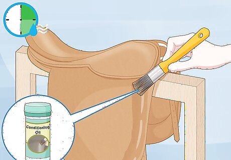 Apply some conditioning oil with a paint brush. Fill a bucket or paint tray with your oil and dip your paint brush in it. Brush your leather in horizontal back-and-forth strokes across every section of your saddle. You will see the oil soak into the skin of the saddle. Let it air dry for 15-30 minutes.Tip: Depending on how long its been since the last oiling, you may need to apply multiple layers. You can tell if your saddle needs an additional layer of oil if it soaks the oil up immediately after you apply it. If you can't see any oil on top after you brush it, it probably needs a second coat. If you rarely ride in hot or wet conditions, pure neatsfoot oil is the best option for finishing your saddle. Neatsfoot oil is made from the bones of cattle, and does an excellent job of naturally protecting leather. You should condition your leather saddle at least once a month. Get a blended oil if you ride in hot, humid conditions. You can use olive oil if you don't have access to a specialized oil, but it won't penetrate and protect the leather as well as a blended or neatsfoot oil. Avoid buying compound or blended oil with petroleum in it.