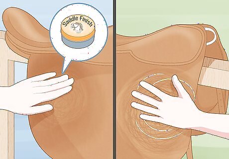 Apply some finish by hand and rub it in. Saddle finish will seal the protective oil into the fibers of the leather and ensure that it doesn't rub off on your pants when you ride. Finishes are generally applied by hand, although your particular brand may require a brush or sponge, so check the label before you stick your hand in the canister. To apply your finish, scoop out a handful of the lacquer or conditioner and rub it gently on top of your saddle with the palm of your hand. Rub it in using circular motions and keep your fingers spread. Cover every part of the leather and let it air dry. Lacquers and conditioners are both finishes. Lacquers tend to dry faster, while conditioners tend to be thicker and easier to work with. Get a clear or colored leather finish based on your preferences, and look for a brand that is waterproof by reading the label. Purchase a finish online or at a local outdoor goods store.