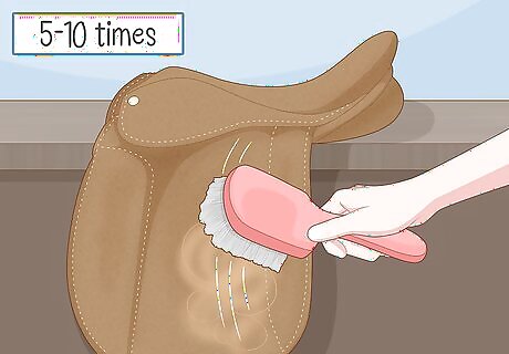 Flick dirt and dust off of your saddle in quick strokes. Hold the brush firmly in your dominant hand and use quick back-and-forth strokes to begin brushing your saddle. Brush each section that you wish to clean 5-10 times before moving to a different part of the saddle. Flick the brush away from you to avoid getting residue in your eyes as you knock it out. You can sit down and brace the saddle in your nondominant hand if you don't have a stable table or saddle stand to brush it on.
