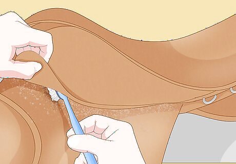 Use a toothbrush for fine details and hard to reach areas. With your saddle still soapy and wet, take a clean toothbrush and use back-and-forth strokes to dig under the cantle, seat jockey, and strap holders. Brush along all straps and handles. Use your toothbrush to clean inside any carved details or inlays.