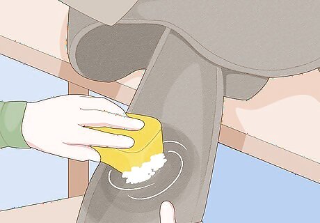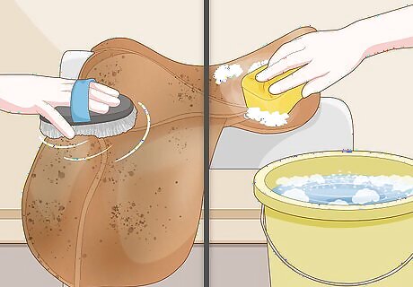 Use a sponge to scrub the saddle in circular motions. Fill a bucket with your saddle soap and warm water as needed. Soak your sponge in the saddle soap and wring it out in your bucket. Scrub every section of your saddle in soft, circular motions. Cover each section of your saddle at least twice. Use a tooth brush to get under any hard-to-reach areas.