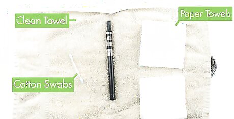 Begin in a clean area. You won't clean your electronic cigarette properly if you start in a dirty area. Make sure to start in a clean, sanitary area. Lay a clean towel on the table where you will be disassembling the electronic cigarette. Gather some fresh paper towels to use on the electronic cigarette. You may also need some cotton swabs for hard-to-reach areas.