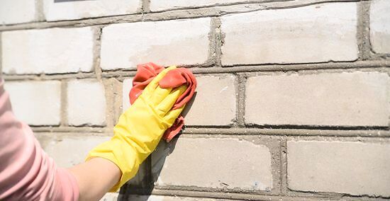 Apply a mild cleaner or dish soap to the surface of the brick. Dip a washcloth in dish soap or a mild home cleaner mixed with water, as directed by the packaging. Wipe the solution over the surface of the brick in gentle, circular motions, coating the entire brick in the cleaning solution. For deeper set stains, you can apply a mixture of boric acid and water instead. Make sure to wear goggles, gloves, and long-sleeved clothes and work in a well-ventilated location.