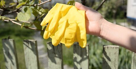 Put on a pair of goggles and thick, rubber gloves. While handling boric acid, make sure to cover your eyes and any skin that will directly handle the cleaning agents. Wear goggles to protect your eyes and rubber gloves to protect your hands and forearms. Wear long-sleeved clothes, if possible, to protect as much of your skin as possible. If you have long hair, pull it back tightly in a bun or ponytail while cleaning with acid.
