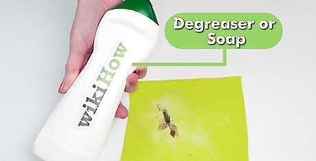 Choose an appropriate degreaser or soap. After you've cleaned up the excess grease, you'll want to use a degreaser or soap to prevent the grease from setting. The product you choose will weaken the grease and help separate it from any surface it is on. Use an appropriate degreaser product for metal materials. Quick Degreaser should work well on grease stains on concrete or similar surfaces. Use dish detergent or laundry soap for fabrics and carpet. For example, Dawn soap works great against grease on a variety of materials. Pick an appropriate product if you have hardwood or wood laminate in your home.