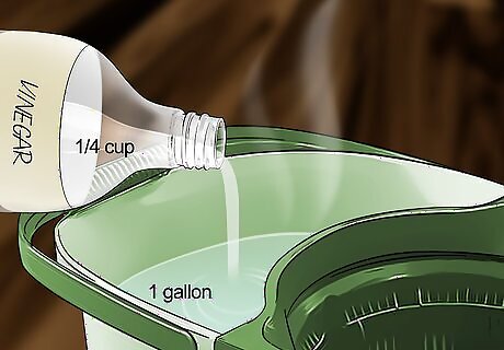 Mix vinegar and hot water. Add 1/4 cup (60 mL) of white vinegar to a gallon (3.8 L) of warm water. Stir thoroughly to get a natural cleaner effective on grime. Vinegar is an acid, so too much of it can wear away the seal on the wood. You may also put in a few drops of an essential oil, such as lemon or lavender, for a pleasing smell.