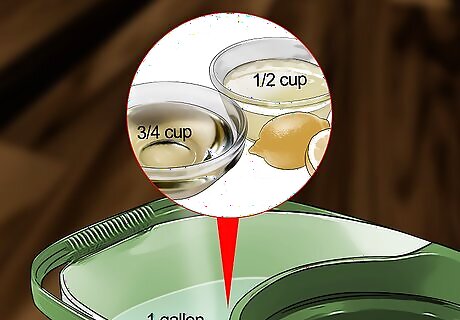 Mix water, olive oil, and lemon juice. In a mop bucket, combine ¾ cup olive oil (180 mL) with ½ cup (120 mL) lemon juice into a gallon (3.8 L) of hot water. The lemon removes grime, but the oil shines the floor.