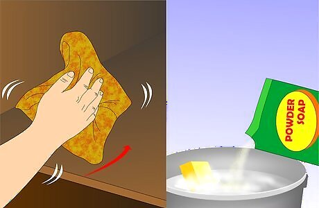 Close the cabinet doors. Place some oil soap in a container and dilute it with warm water. Then, test the oil soap on an inconspicuous part of the cabinet's surface to make sure that it does not harm the finish.