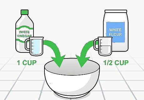 Mix vinegar and flour. Get a container. Put in a cup of white vinegar and half a cup of white flour. Mix these ingredients until they form a paste that you can use on the pewter as a polish. You can also buy polish in stores. Choose a mildly abrasive polish designed for pewter rather than other metals.