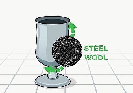 Brush satin pewter with steel wool. Steel wool should You can apply the polish with steel wool or use the steel wool while the polish is fresh. Very gently, move the steel wool in the direction of the grain. Avoid pressing hard so you don’t leave scratches. This will make satin pewter look new again. Only use steel wool on satin pewter unless you’re trying to repair deep scratches on polished pewter. This process should only be done once a year at most.