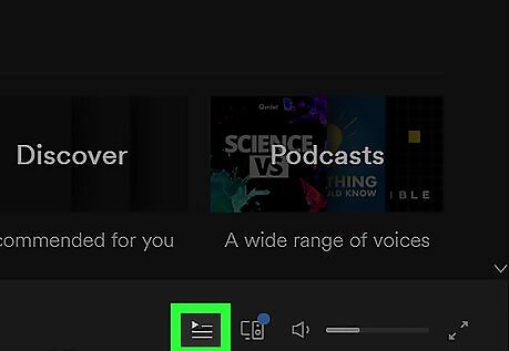 Click the queue icon. It’s near the bottom-right corner of Spotify. It looks like 3 horizontal lines and a small triangle. This opens the queue.
