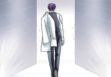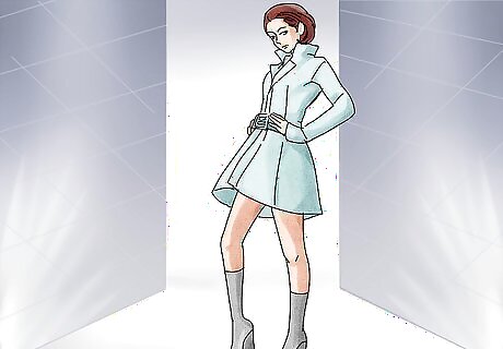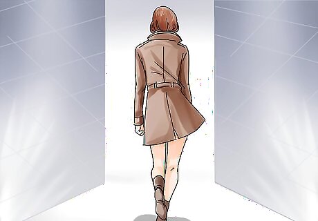 Turn and walk back to the starting point. After posing, turn by pivoting on the balls of your feet. Keep your face towards the end of the runway as you turn until you’ve turned around completely. Step forward again with your lead foot and return to your starting position. Depending on the desires of the show director, you may need to pose again. Turn by pivoting on one of your feet and strike a pose. Pivot again and leave the stage. When you reach the end of the runway you may have the opportunity to do more than one pose. If so, keep pivoting and shifting your weight back and forth to maintain your rhythm. If you have a long train, walk in a semicircle around the end of the runway instead of pivoting to show off the garment.