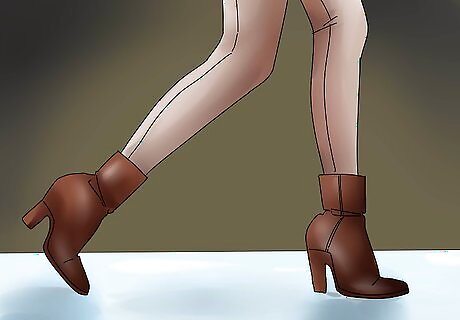 Practice walking in heels. Put full length mirror at the end of a hallway and walk back and forth. As you walk, ask yourself if you look graceful and confident. Experiment with alternate poses and walking rhythms. Walk until you can confidently walk forward without looking down or tripping. Watch videos of popular runway models walking. Take note of how they position their bodies and show a walking rhythm. Ask a friend to watch you walk and give you feedback.