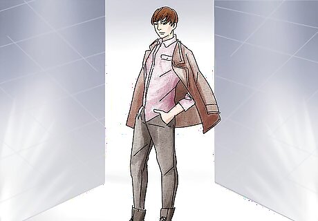 Pose at the end of the catwalk. Make sure you stop for three to five seconds. There are a lot of great poses to choose from. However, the most common pose for men is the “c” pose. Place your left hand on your hip and arch your back away from your hand. Point your right toe out towards the audience and turn your face to the right. Watch videos of popular male models on the runway to find new positions. Balance your weight on your back foot when you pose.