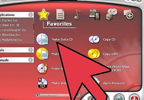 Open up your DVD burning software (like Nero, Roxio, Alcohol, or any other) and select "Burn New CD" (or DVD, they're the same). A window will come up directing you to select what type of DVD you want to burn. Unless you're backing up movies, select "data." In the next window you will need to select what files you want to put on it. After you have finished selecting your files it will tell you if you've selected too many and you may need to redo this step.