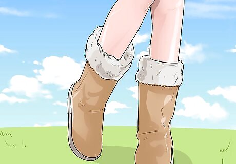 Change your hands and feet into paws. If you have a Spirit Hood, your front paws are already covered. If not, it is simple enough to use a pair of mittens, which you can wear on their own or decorate with furry material or felt. Boots are very common in cosplay. Find a pair of boots which matches the look of your breed. Choose a nice sleek, tall boot for a short haired dog. Find a fluffy boot like furry Uggs for a long-haired look.