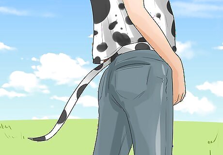 Tie it off with a tail. No dog costume is complete without a tail. Depending on the breed you chose, you may want and thin tail or a fluffy tail. You can achieve these looks using felt or yarn in the appropriate colors. For a fluffy tail, cut 10 pieces of yarn 5 inches long and tie them together in the middle to make a sort of tassel. Make several of these tassels. Using the string tied around the middle of the tassel, tie these tassels to a longer string which is a little longer than the length of the tail. Tie this to a belt or use more yarn to wrap around your waist and tie the tail on. Make a tail out of felt or another material of your choice. Cut the material five inches wide and the length you would like for your tail. Roll the material starting with the end of the tail, which should come together at a point, ending at the top, which should be left open. Sew the edges together to create a long cone shape. Stuff the tail with cotton stuffing and place a flexible wire in the center if you would like to be able to adjust the shape of the tail. Sew the top together and sew an additional loop to the top to thread a belt through.