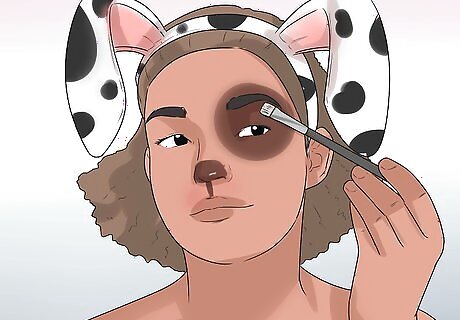 Paint your face to look like a dog. You will want to focus on painting the nose and mouth of a dog by tracing around the tip of your nose in black, brown or pink paint, depending on your breed. Also create the dog muzzle between your nose and upper lip using a lighter color. Here you can add some whiskers. For a playful look, paint a red or pink tongue over one side of your bottom lip and extending past it to look like your tongue is hanging out. Outline the tongue with a thin black line. Spotted dogs can paint a big spot around one eye.