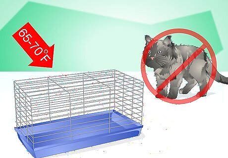 Set the habitat in a warm spot indoors. Hamsters are very sensitive to temperature changes and their surroundings. Place the tank or cage inside of your home in a spot that is warm and away from other pets that may scare or harm your hamster. Make sure the area is in a spot that has a consistent temperature between 65 to 70 degrees Fahrenheit (20 to 25 Celsius). Avoid places that get drafts, such as garages or breezeways, or are exposed to high heat from direct sunlight or heating devices. These can undermine your hamster’s health or kill it. Instead, consider putting the hamster cage in your living, dining, or entertainment room. A finished and heated basement or kitchen may also work. Remember to keep the cage away from food preparation or storage surfaces. Be aware that hamsters are nocturnal and may keep you awake if the cage is in your bedroom.