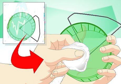 Disinfect toys and hiding spaces. Just as the dishes and bedding can get soiled, so can your hamster’s toys and hiding spaces. Once a month, clean all of the toys and replace anything that is broken or could harm your hamster. Use a mixture of vinegar and water to clean your hamster’s toys including her exercise wheel. Wipe them off and then allow them to dry completely. As the toys dry, inspect them for cracks or other flaws that could harm your hamster. Consider throwing away broken toys. Avoid disinfecting chew toys because cleaners can harm your hamster. Instead, throw them away and replace them with new wood blocks, dog biscuits, or chew toys. Throw away any paper toys and replace them with new ones to prevent bacteria growth.