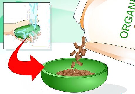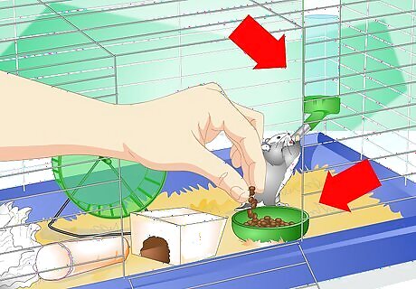 Refill the food. Keeping your hamster’s food dish refilled and clean helps him stay healthy and happy. Put new food into the dish as needed and wash the dish at least once a week. Give your hamster just enough food to keep her from getting hungry. Remove crumbs or any other material, like feces, before you refill your hamster’s food dish. Clean the dish with hot, soapy water or in your dishwasher at least once a week. If your hamster sprayed or defecated in it, you’ll also need to remove the food and disinfect it. Allow the dish to dry completely before putting in new food to prevent bacterial growth.