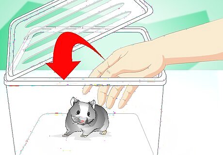 Put your hamster in a safe place while cleaning. Take your hamster out of her habitat and put her in a safe place while you do this. This can allow you to safely clean the cage without your hamster nipping you. Allow your hamster to have “outside time” in a safe space while you clean. Make sure he is in an area that is screened off or secured so that he can’t escape. You could also put him in a separate cage or your bathtub, so long as the drain is covered. Some other places you could put her are in a hamster ball, a securely covered and ventilated box, or even an empty dresser drawer. Give your hamster food pellets to occupy him while you clean. It’s important to either place your hamster in a space that is secure or where you can watch him.